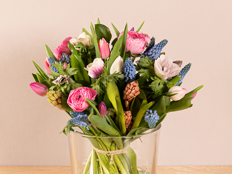 Boeket in pastelkleuren met echte voorjaarsbloemen, waaronder tulpen, harmonieus gebonden.