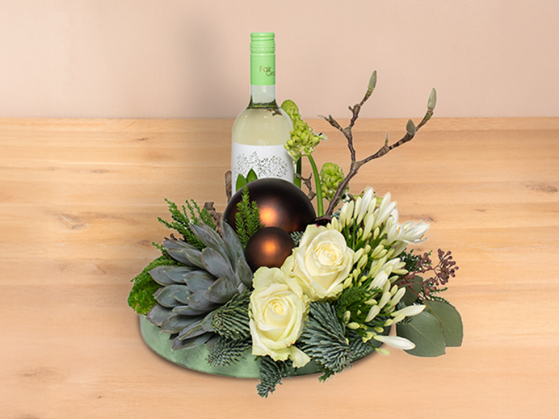 Wit kerstarrangement met fles biologische witte wijn.